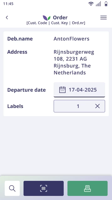 Indien u de Address Label App als los proces (stand-alone) gebruikt, begint u met het ophalen van de juiste klantgegevens. Dit doet u door een ordersticker/klantcodesticker te scannen of door de debiteur handmatig op te zoeken via de zoekfunctie. Vervolgens kiest u het gewenste aantal stickers en drukt u op printen.